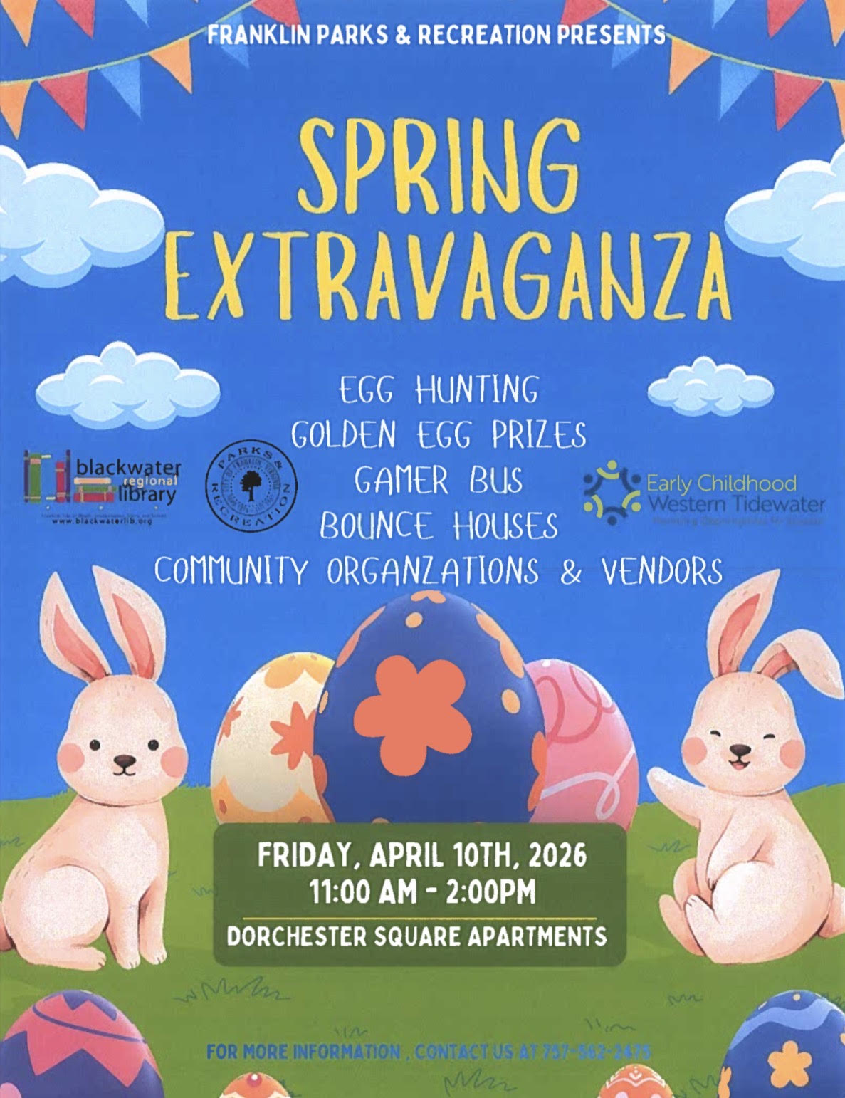 Join Franklin Parks & Recreation, Early Childhood Western Tidewater, and Blackwater Regional Library Outreach for the Spring Extravaganza at Dorchester Square Apartments! There will be an egg hunt, prizes, gamer bus, bounce houses, free books, and community organizations and vendors. Free to attend!